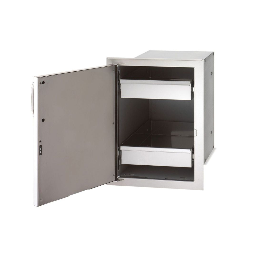 Store your grilling accessories, both large and small, neatly out of sight with the Fire Magic Select 14-Inch Left-Hinged Enclosed Cabinet Storage with Drawers. Designed for easy access while grilling, this enclosed storage solution helps you keep your outdoor kitchen organized and your tools within reach whenever you need them. It perfectly complements Fire Magic series grills for a cohesive, stylish outdoor space.