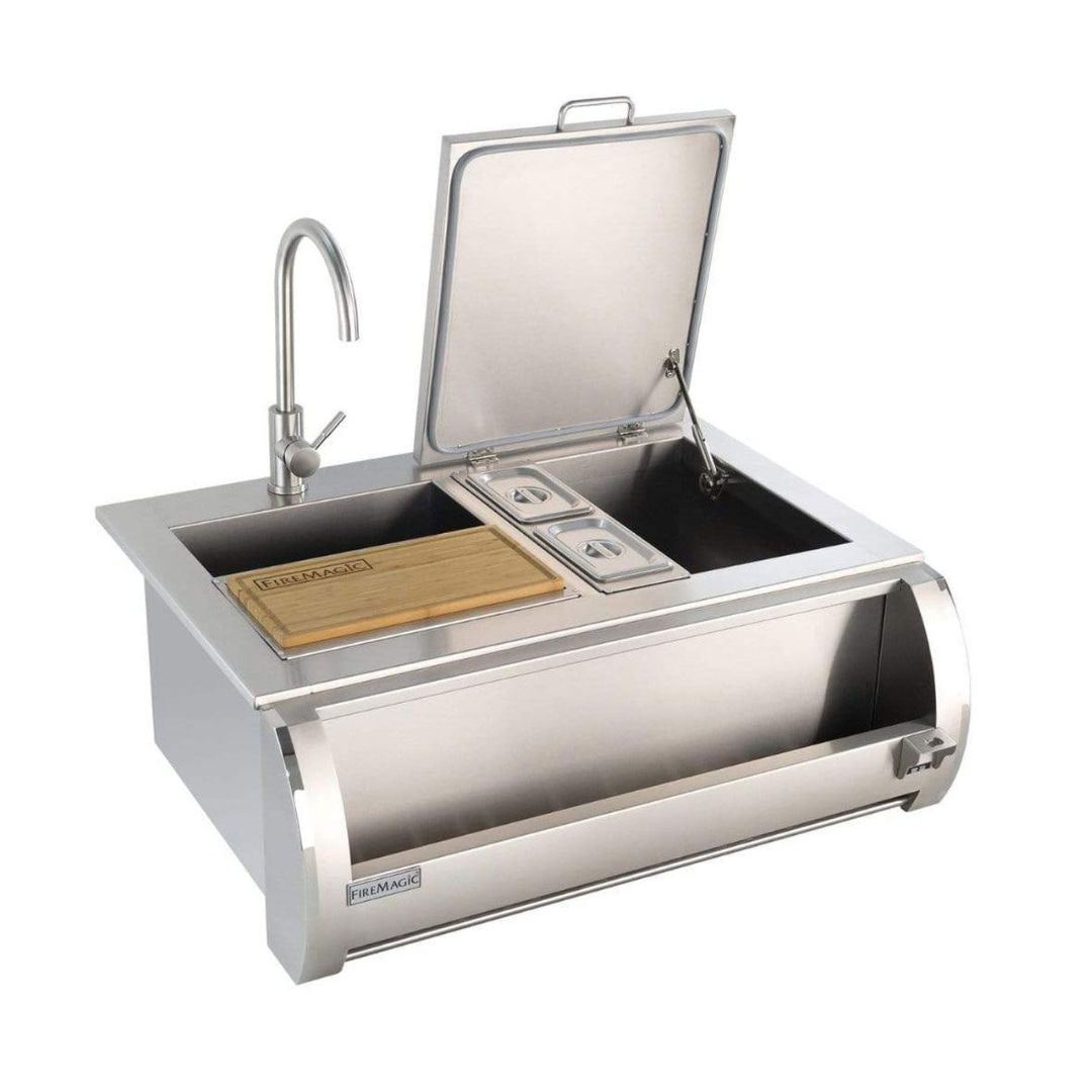 Elevate your outdoor entertaining with the Fire Magic 3835 Beverage Butler with Stainless Steel Faucet, a high-end beverage center designed to enhance your outdoor kitchen. Made from durable 304 stainless steel, this all-in-one beverage butler includes a stainless steel sink, hot and cold faucet, insulated ice chest with a removable lid, front beverage caddy with towel rack, bottle opener, removable cutting board, and condiment trays. This convenient setup provides added storage and prep space while keeping drinks easily accessible.