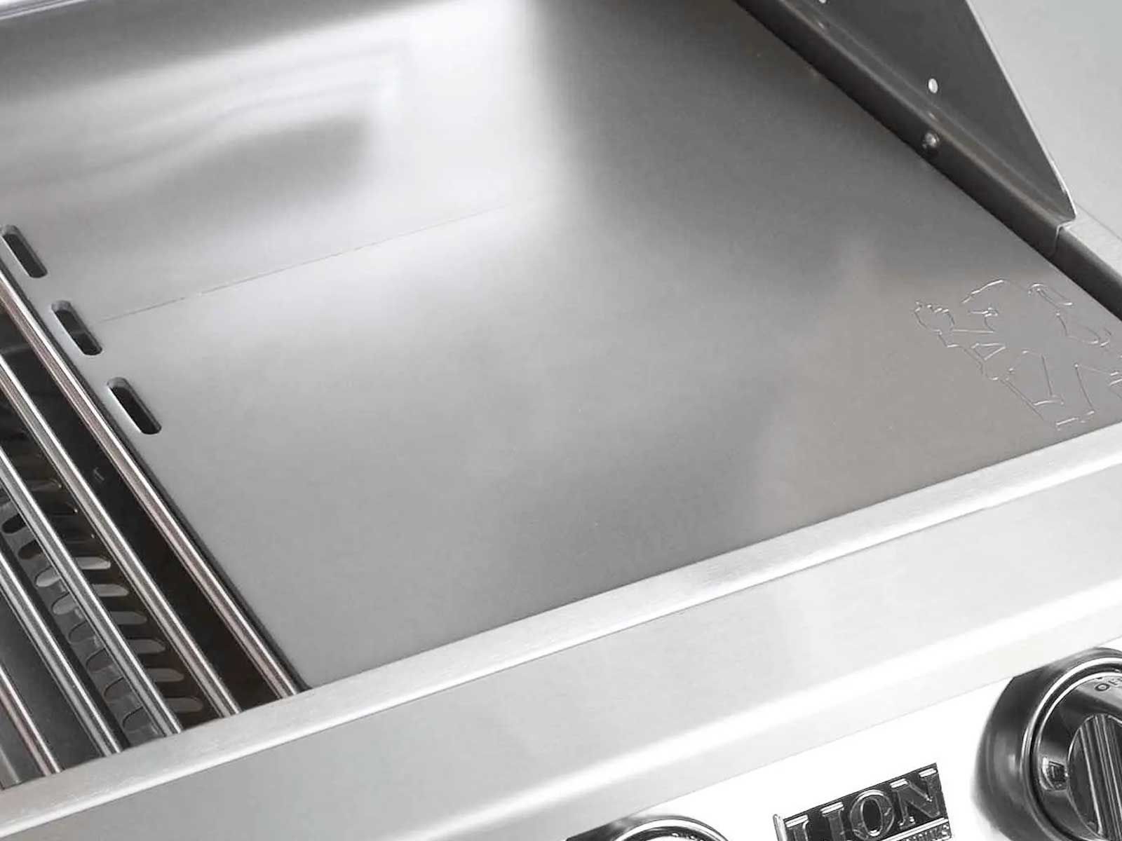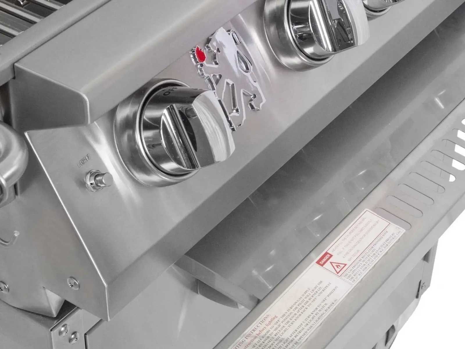 Equipped with five Lion Quick Lite valves, this grill ensures you're ready to cook in no time. The easy-to-use push-to-turn knobs simplify the grilling process, allowing you to focus on creating delicious meals. The commercial-grade 304 stainless steel construction, featuring a double-layered, seamlessly welded grill head with polished edges, not only delivers a sleek aesthetic but also guarantees enduring strength and resilience.