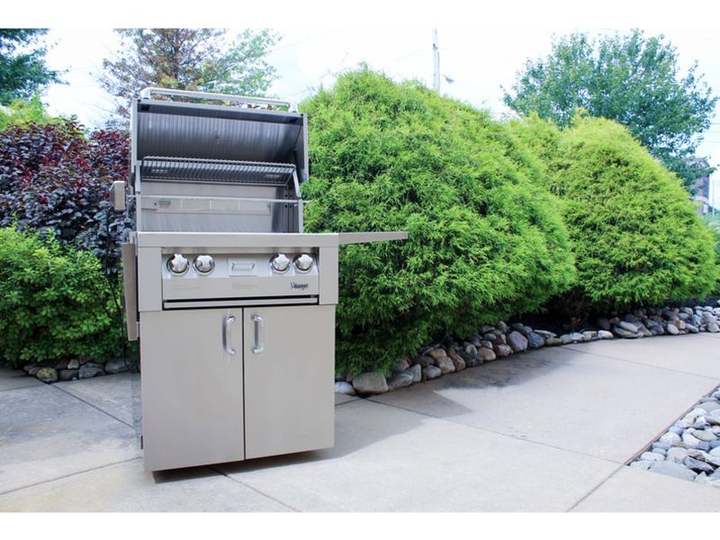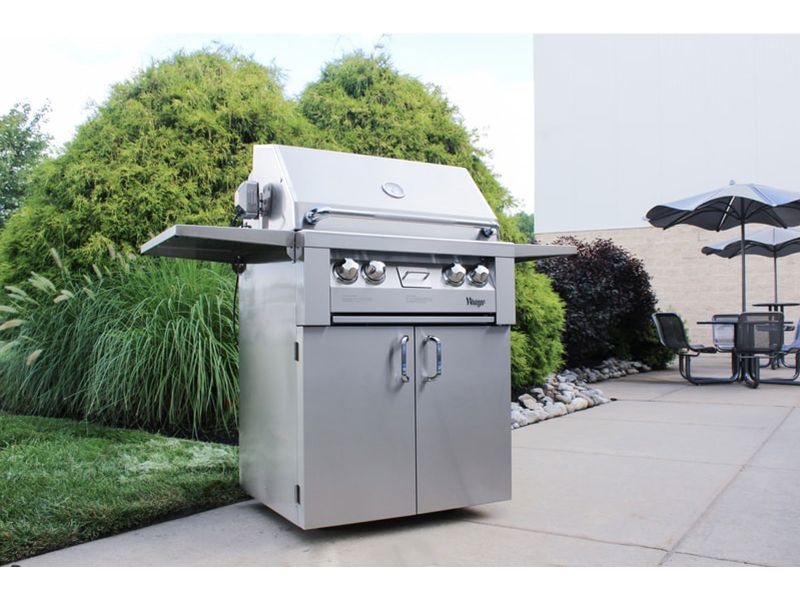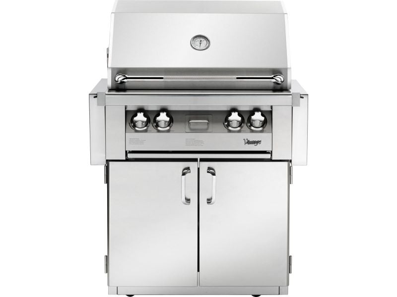 Enjoy powerful grilling outdoors with the Vintage Grills 30-Inch Freestanding Gas Grill with Flush Mounted Infrared Rotisserie Burner and Dedicated Smoker Burner. This grill features a 15,000 BTU flush mounted infrared rotisserie burner that allows you to roast meat while you grill on the stainless steel grates. It has an insulated canopy with double walls, giving you seamlessly polished edges. There is also an integrated thermometer in the hood so you can keep track of the temperature. With three 27,500 BTU burners, you can enjoy intense and consistent heat that is conducted through the ceramic briquettes.