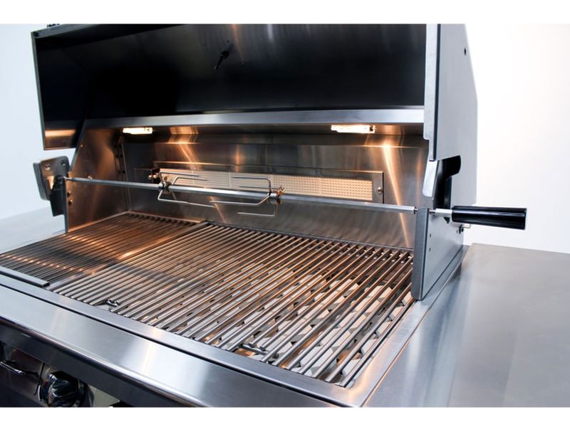 - 12,000 BTU Flush mounted Infrared Rotisserie burner and polished stainless steel grill grates