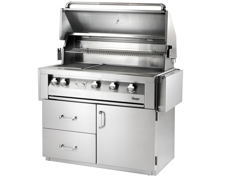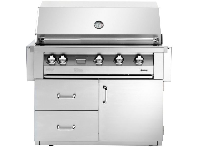 Cook more efficiently and conveniently than ever before with the Vintage Grills 42-Inch Freestanding Gas Grill with Flush Mounted Infrared Rotisserie Burner, Dedicated Smoker Burner and Sear Zone on Deluxe Cart. This powerful gas grill comes complete with a flush-mounted infrared rotisserie burner in the back for easy roasting of meats. Achieve the perfect sear thanks to the included sear zone, as well as a dedicated smoker. The canopy is double-walled and insulated to keep heat where it belongs, while the spring-assisted lid ensures that it is effortless to open and close.